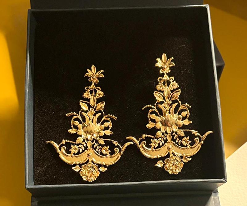 La pieza más especial son unos llamativos pendientes bañados en oro de 24 quilates, que han sido elaborados en exclusiva para Lina Sevilla por el taller cordobés Paula Orfebres. El diseño, inspirado en el estampado de un pañuelo propiedad de la marca, traduce al metal los dibujos y bordados icónicos de las prendas de esta firma, de forma que la herencia textil se transforma en una joya.